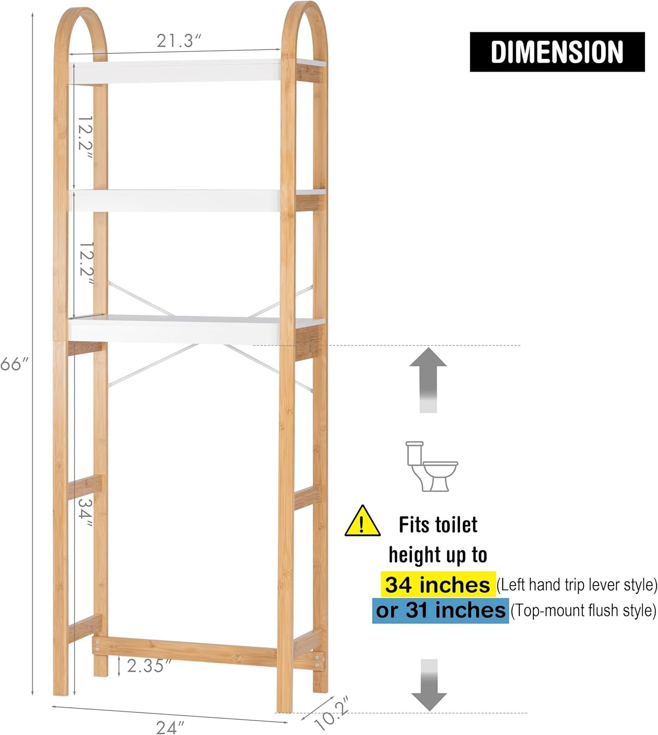• Multi-functional toilet overhead bathroom storage shelf: The three-tiered open shelf provides ample storage space for your bathroom essentials, making it easy to access toiletries. This toilet shelf features a flexible design and versatile use, suitable not only for the bathroom but also for laundry rooms, balconies, and living rooms, meeting diverse storage needs. The minimalist and stylish toilet shelf features smooth white MDF shelves, bamboo-colored side frames, and an elegant curved top cover, giving it a clean and simple look that complements most modern bathroom styles. The sturdy and secure toilet shelf is designed for everyday use, featuring a reinforced X-frame, anti-tipping device, and non-slip rubber feet for superior stability and safety. Say goodbye to wobbling and enjoy a durable and supportive structure. Easy Assembly: With its simple structure, clear instructions, and labeled parts, this toilet-top shelf is quick and easy to assemble. Its compact size (24 inches wide x 10.2 inches deep x 66 inches high) allows for perfect installation above the toilet—elevating the style of your space in minutes!